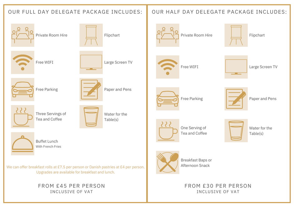 In our Half Day Delegate Package, we offer either bacon, sausage or egg baps for breakfast or an afternoon snack.